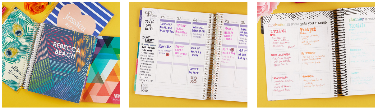 When I first found this planner, I liked the personalized covers, the colorful monthly and weekly sections, and the three boxes per day to add your schedule. It includes monthly spreads, event stickers, perpetual calendars, inspirational quotes, and more recently, boxes up front for adding goals. They started as a little woman-owned business in southern California and have grown exponentially in the last few years; you can even find planners and accessories at Staples now. They’ve added more ways to personalize with a wide variety of now interchangeable covers, different colored coils, colorful and neutral palettes, and three different layouts for the week – the original three box view, hourly, and horizontal. With these changes, they have made the planner a little more man-friendly too, as the planner really is targeted at women, used frequently by lifestyle, food, and mommy bloggers especially.