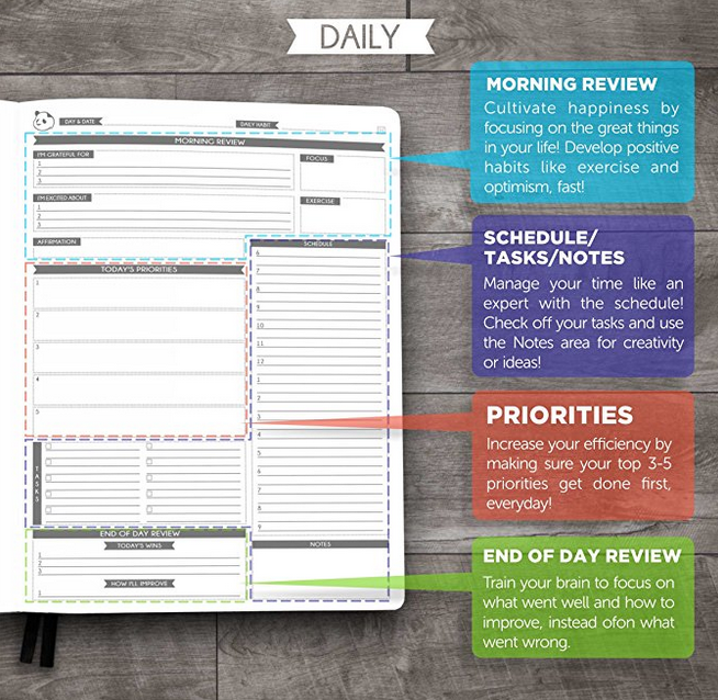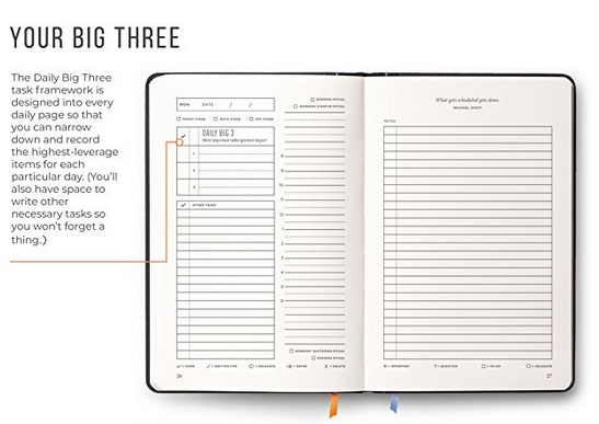 The Full Focus Planner comes from time management guru Michael Hyatt and incorporates all his tips and processes in one undated, hardbound book. This one is more business-like and includes great features like pages to articulate your daily routines, goal trackers, and weekly and month reviews. Each day gets a full two-page spread that includes space for your “Daily Big 3” goals, a task list, daily appointments, and a full page for notes (see below). I thought long and hard about this one as it seemed to have everything I wanted in terms of tracking daily rituals, projects, goals, and my days. But the big con for me was that, because each day gets its own two-page spread, this planner only lasts three months; it would be huge if it covered a full year. So you have to buy four of them to get through the year, while more than doubles the cost of an EC or Passion Planner. And I couldn’t figure out how I could record future meetings and events without carrying multiple books around. So this one was a no for me.