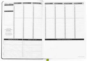 The Passion Planner is designed to help you articulate goals, draw your Passion Roadmap, and track projects throughout the days and weeks of the month. It provides regular space to plan and reflect on your time. Passion Planner includes timed weekly spreads (below) and monthly calendars, all undated so you can start using the planner at any time during the year. Each weekly spread includes space for articulating weekly and daily intentions, motivational quotes, space for personal and professional to-do lists, a spot for gratitude, and a space for a small piece of your Passion Roadmap or doodles. It’s about as thick as the EC LifePlanner and soft rather than coil bound. I ordered this planner and liked it, but as I thought about setting it up for Fall, I realized it was a little too structured for me, so I returned it.