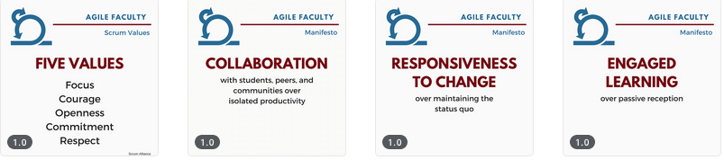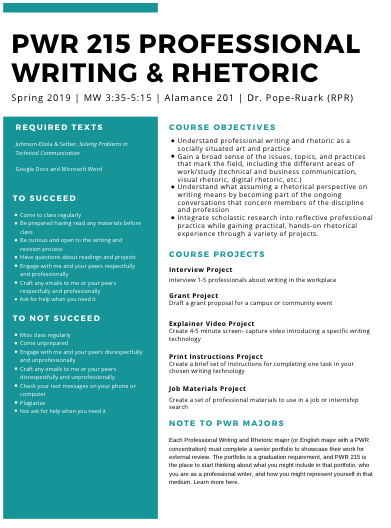 Canva is a design tool that allows you to create a variety of visual documents – from posters to resumes to infographics to social media graphics – from their extensive library of templates and options for customizing the design. The free templates allow you to edit text and layout, add shapes, chance background and text colors, and choose stock images from their free library (many other images are available for a small fee, usually $1). Because I can use this tool for both work-related documents like course posters and syllabi (see right) as well as for Agile Faculty tasks, I pay $12.95/mo for the advanced version. The best features with the paid subscription are that you can create and reuse your won templates (see below) and you can resize any design into another format, like changing and Instagram post to a Facebook page header. For me, the money is worth it.