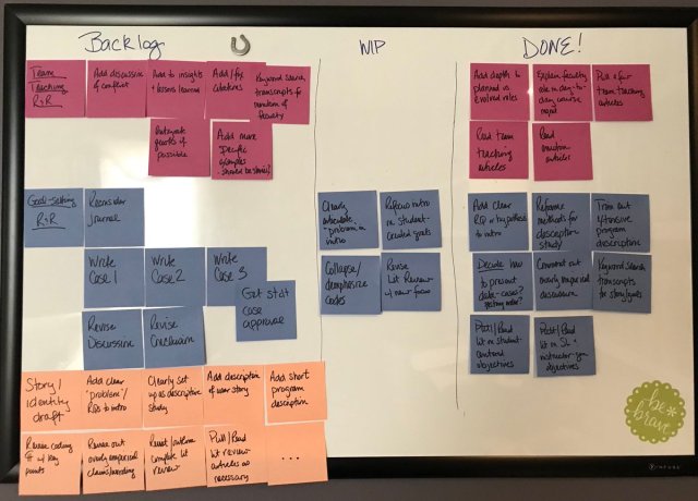 But there is still a lot academics can learn from this text. I appreciated her discussion of how to identify the five time thieves. The way she talks about the time thieves is technical but easy to connect to faculty life – having too much work in progress and constantly reacting to unplanned work are certainly part of our everyday lives. She offers some ways to rethink how these time thieves impact our work. For example, she talks about the Backlog column on a Scrum/kanban board as really a list of options, things that could be done or might be valuable. She argues that once a ticket crosses the “line of commitment,” the line between Backlog and WIP, it becomes a commitment that must be kept. I like this idea of the backlog as a set of options. Dr. Katie Linder told me on Twitter that she used the term “on deck” instead of “backlog” when she set up her board because backlog felt so final and intimidating. I’ve always thought of the backlog as a set of possibilities, so both DeGrandis and Linder’s adaptations make good sense.
