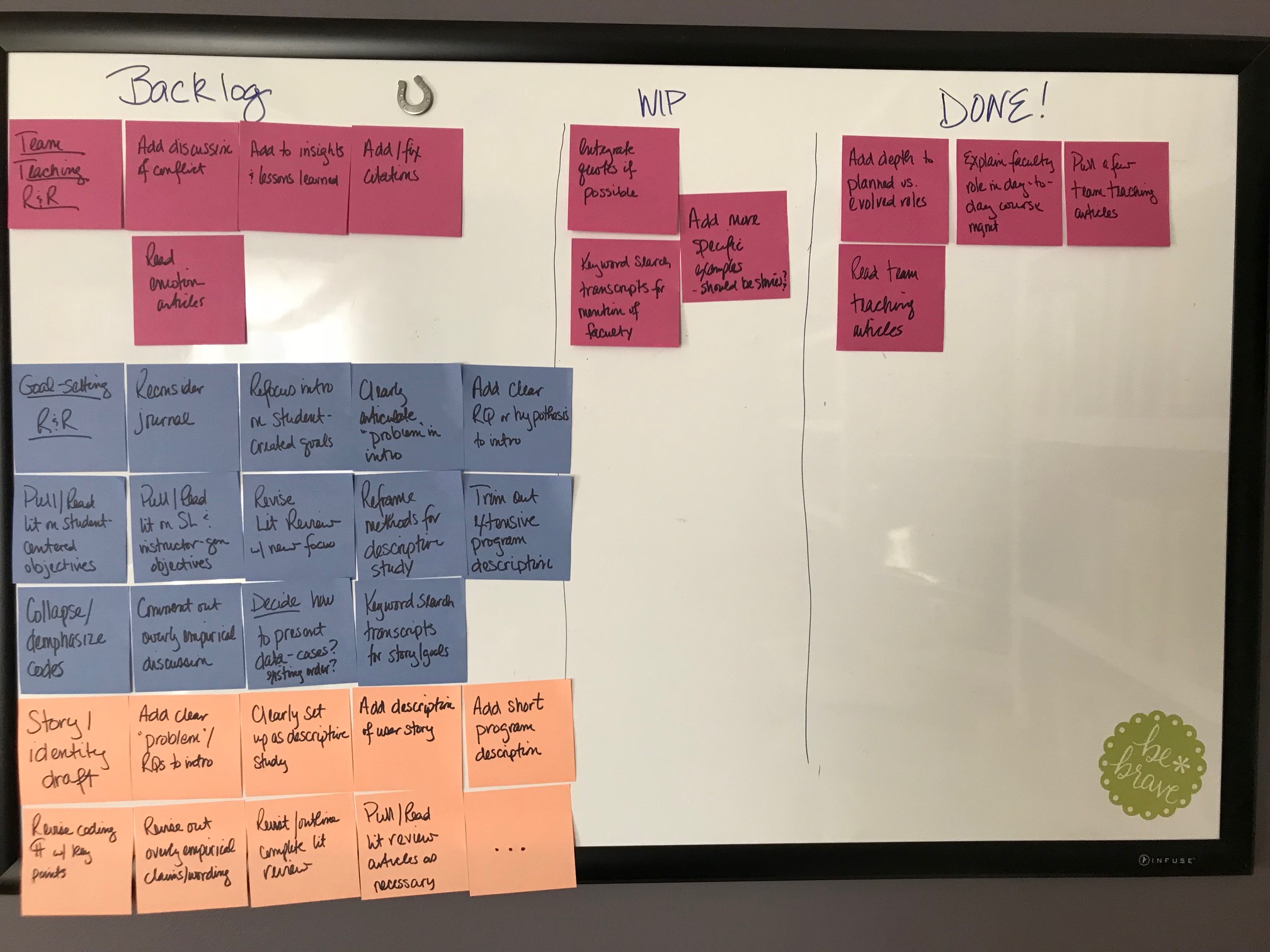 If you you compare this board to the first board, you will see two things. 1) I changed the tickets in the backlog for the article because I had decided to reshape the data section into short case studies. 2) “Collapse/deemphasize codes has been in WIP for several days – I was procrastinating on that one, just like I was procrastinating on “pull student quotes from interviews” last week. So 1) is good – be flexible as you go, that’s what sticky notes are for! And 2) is not good. If you don’t want to do it or are avoiding it, take it out of WIP until you can’t possibly ignore it any longer, OR rethink why you “have to” do it in the first place. It could just be that the ticket is too large and you need to break it up into smaller tasks.