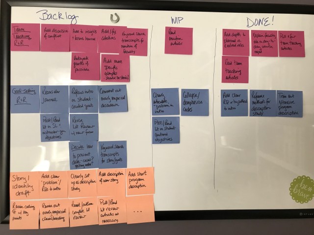 And 2) there is a new set of sticky notes on the board. As I was reading for the team teaching article last week, I went on a little tangent in my reading that I thought was relevant at the time – student emotion in service-learning. That reading didn’t end up being applicable to the team teaching piece, but I found it really fascinating and illuminating in respect to another article I want to write that is further down the backlog. I am NOT starting a new article mid-sprint; being flexible should only go so far. If you keep changing the backlog during a sprint, you’ll never complete anything. So I just put up a few notes of really minor things I can do if I need to change mental gears for a few minutes without totally getting out of the flow of writing. I also added one ticket to the team teaching WIP as well and for the same reason – something I just need to think about for a few minutes that won’t interrupt my larger focus.