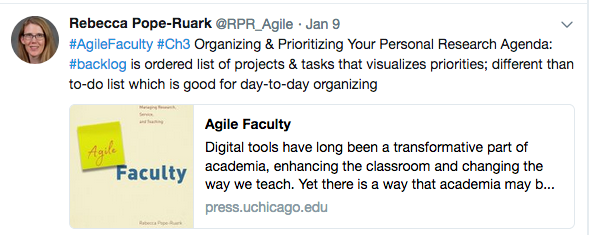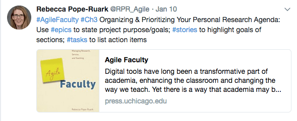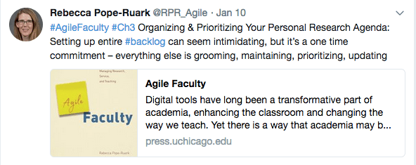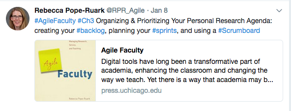 So that’s Week 2 of my first #AFSprint writing challenge. You can follow along during the week on Twitter using the hashtag #AFSprint. Follow me for other tips on applying Scrum and Agile to your faculty work, and take a deep dive by ordering my book, Agile Faculty: Practical Strategies for Managing Research, Service, and Teaching, available now from the University of Chicago Press – use the code PRAGILE for a 20% discount on the cover price!